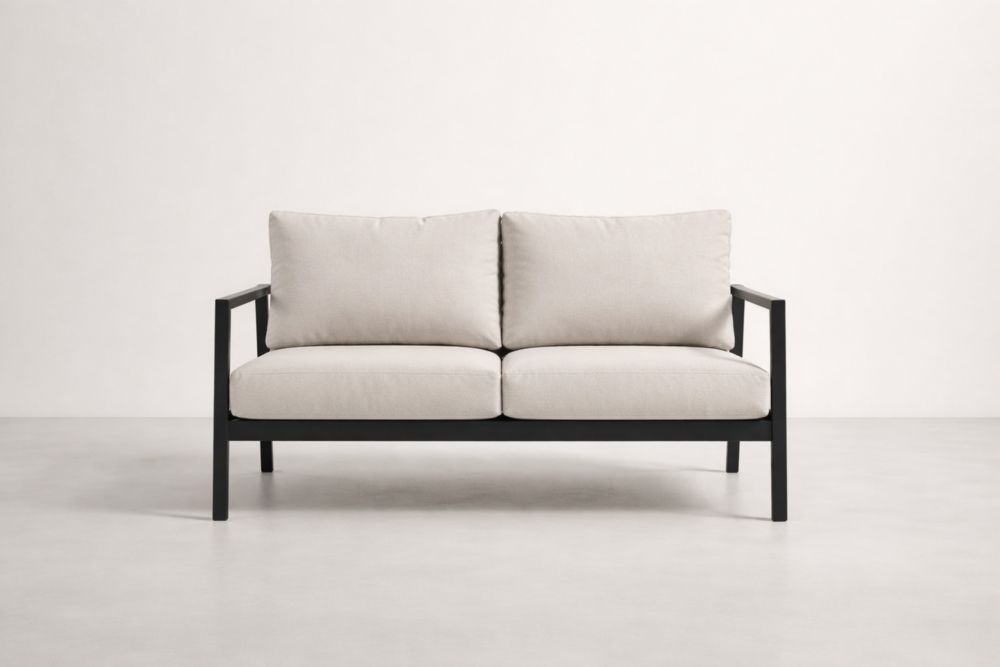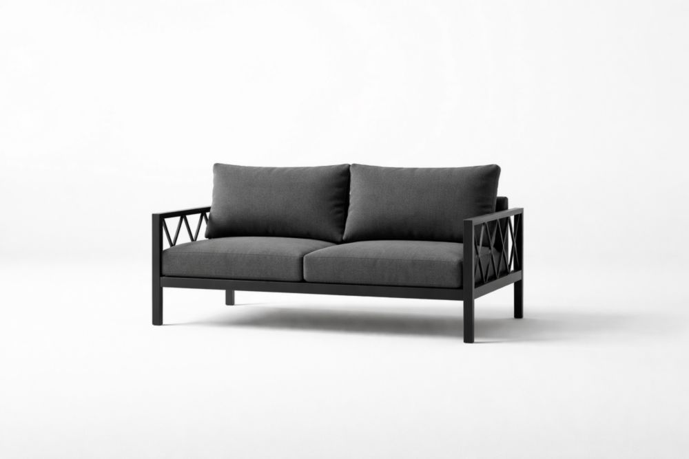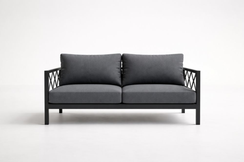Divano a due posti in tessuto grigio con struttura in alluminio