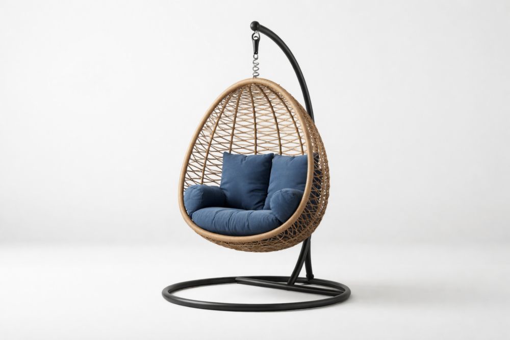 Sedia Sospesa in Rattan con Cuscino Blu e Struttura in Alluminio