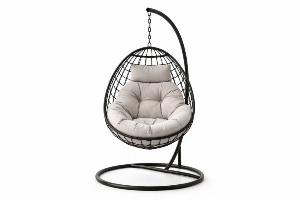 Sedia sospesa in acciaio nero con cuscino in poliestere grigio