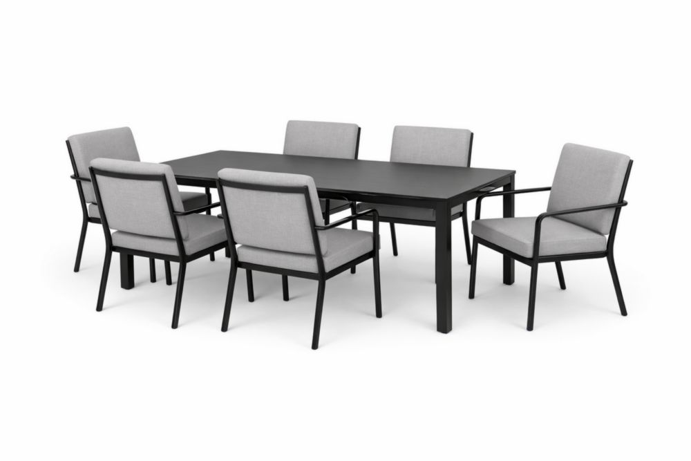 Set tavolo acciaio nero con 6 sedie imbottite grigie